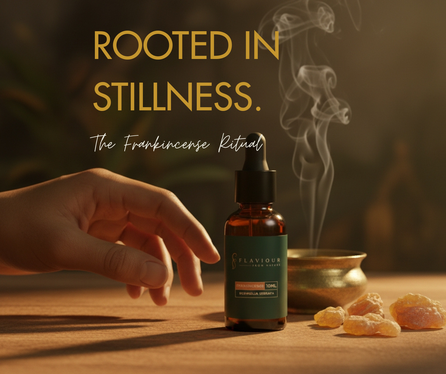 - Method: Mix 1-2 drops of Frankincense Oil with 1 teaspoon of a Flaviour Carrier Oil (such as Jojoba or Almond). Gently warm the mixture between your palms and massage upwards onto the face and neck. Use this ritual at night to support cellular renewal while you sleep.Quick Tip: This blend can also be lightly massaged into the hair ends before bed for subtle aromatic calm.
